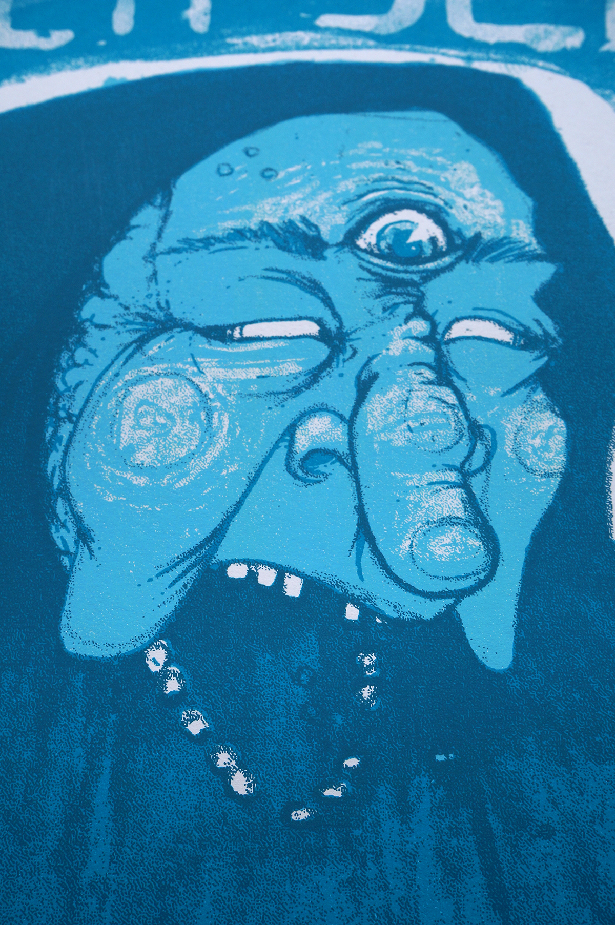hand drawn and painted illustration, 3 color hand screen printed measuring 18"x24" on archival 100lb. french paper. A killer poster for a killer show! signed and numbered standard blue edition of 65. yellow variant of only 15.