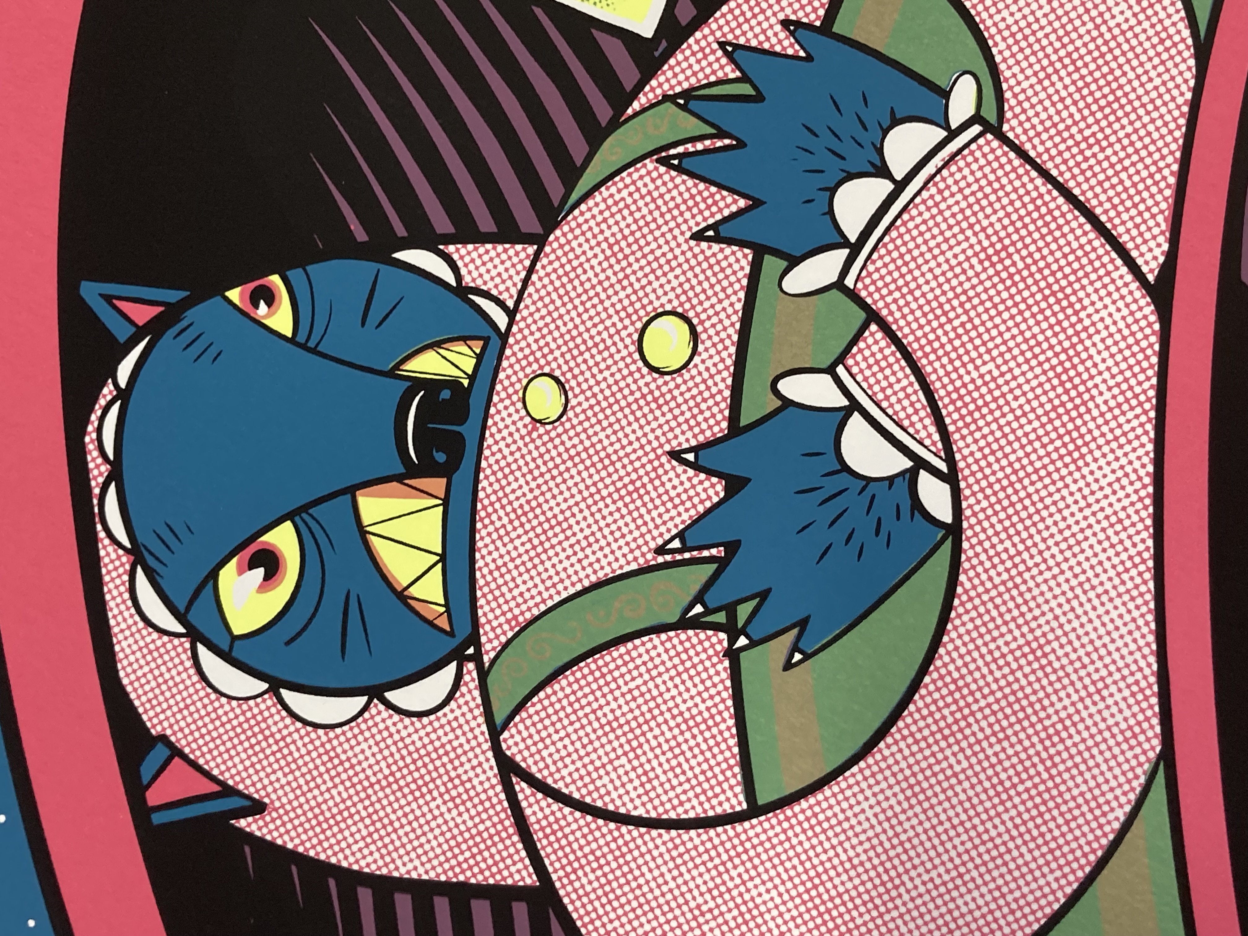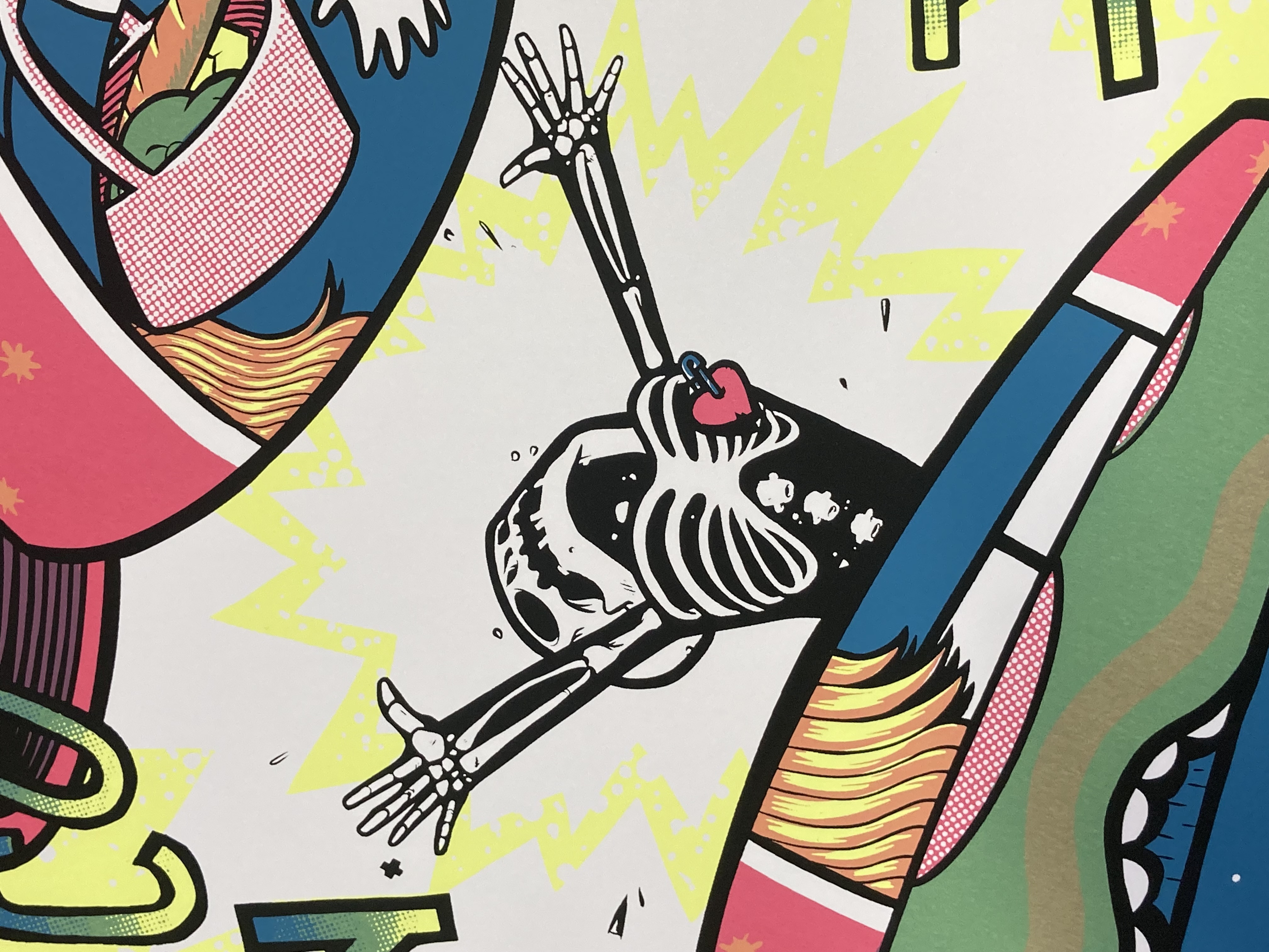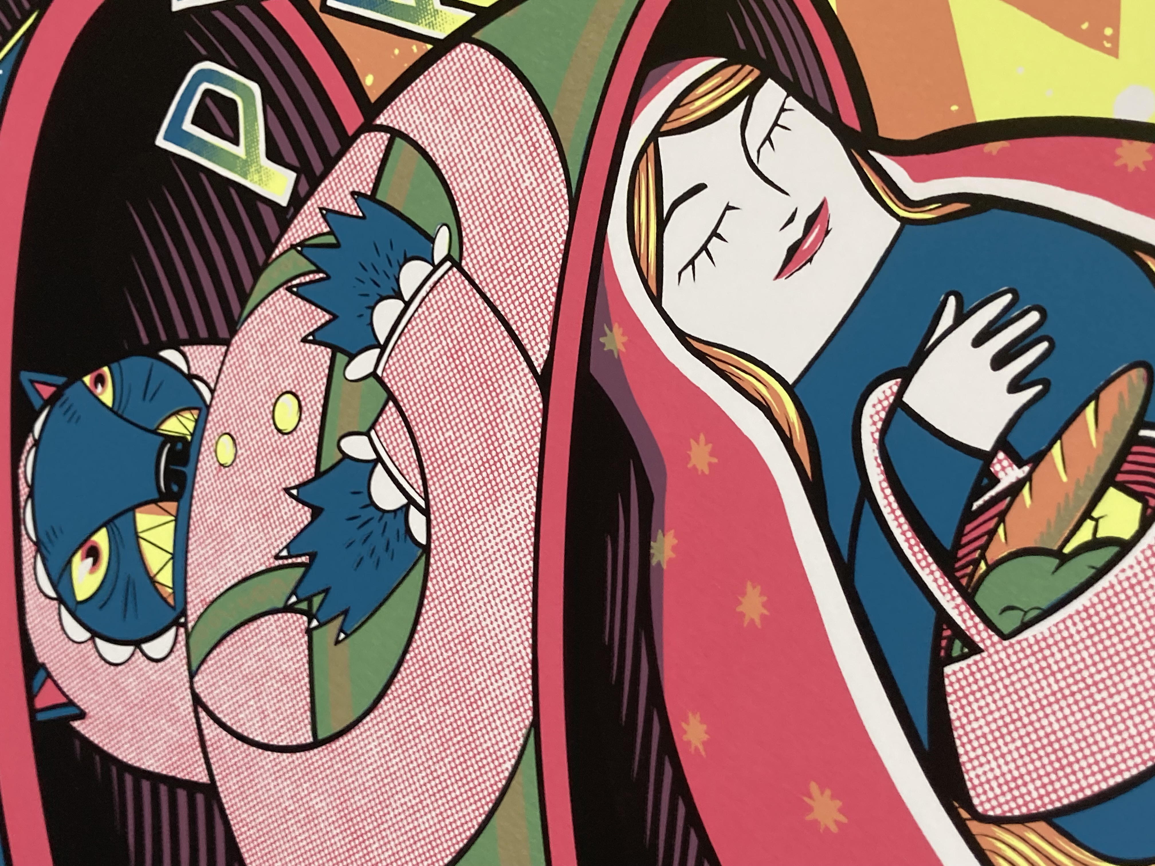 4 color standard, 5 color foil official screen print. Print measures 18x24” on 100lb. Cover. Signed and numbered.