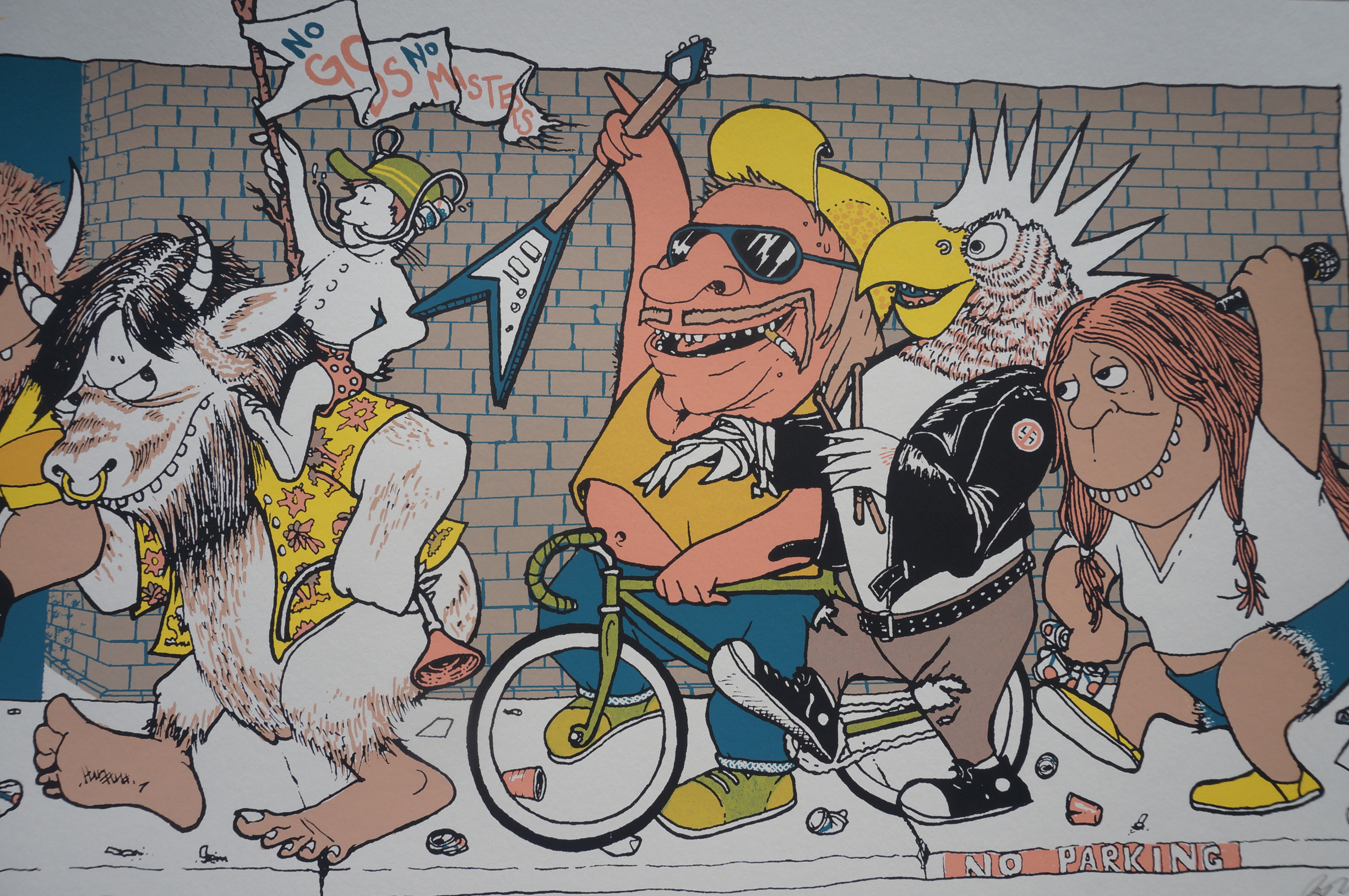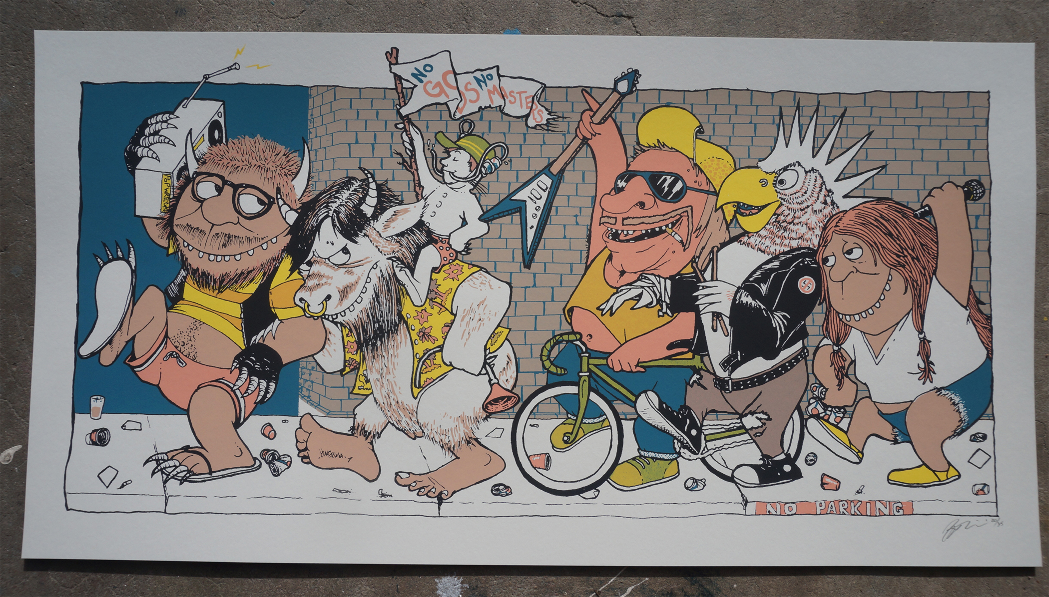 ended up making an updated and slightly revised serigraph version of these guys due to popular demand. so here it is, ‘No Gods, No Masters, No Parking’ goes out to all of my anarchist, unionized, punk rock friends who know the meaning of community. 5 color screen print with transparent overlays, finished print size is 14"x24". edition of only 30