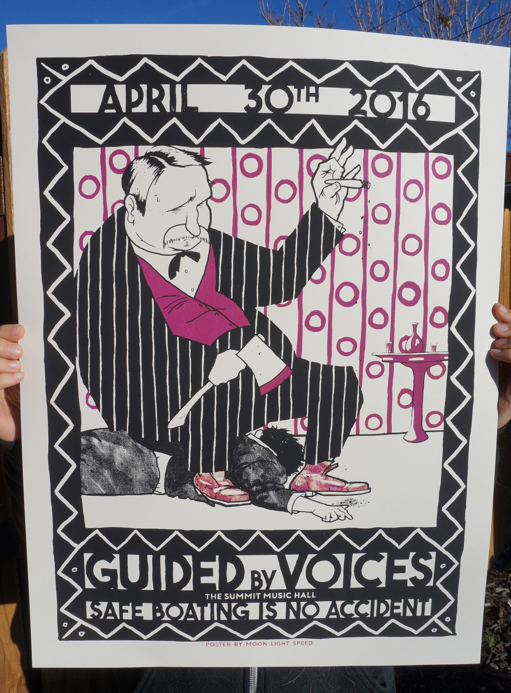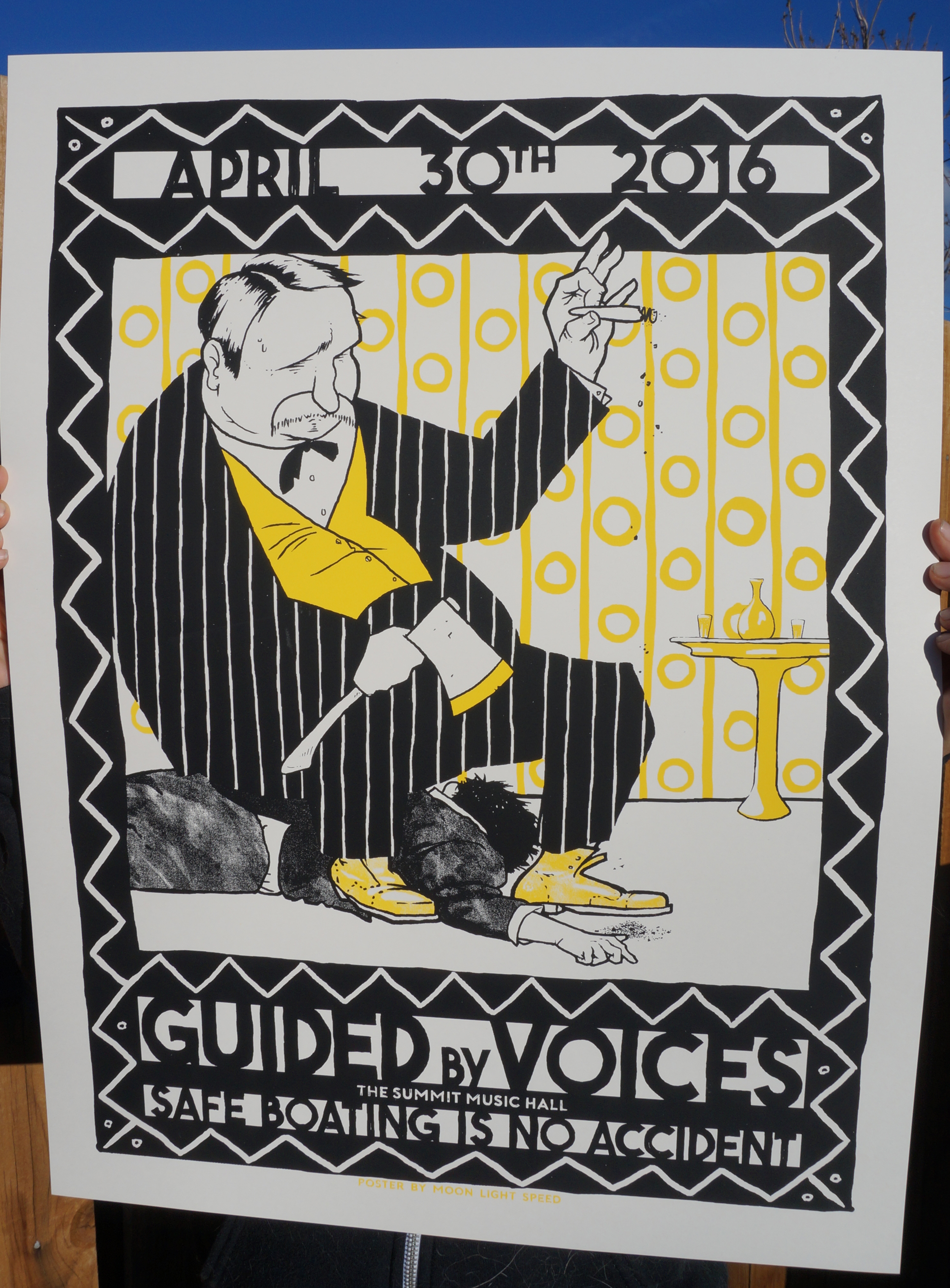 Official, hand pulled, 2-color, 18"x24" screen print for Guided By Voices at The Summit. Standard yellow edition of 100, merlot variant edition of only 10. printed on archival french paper.