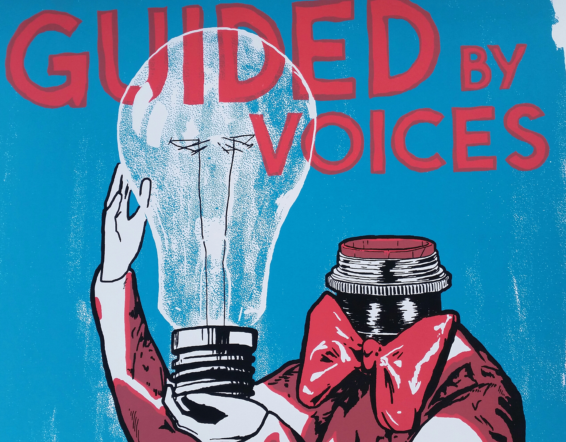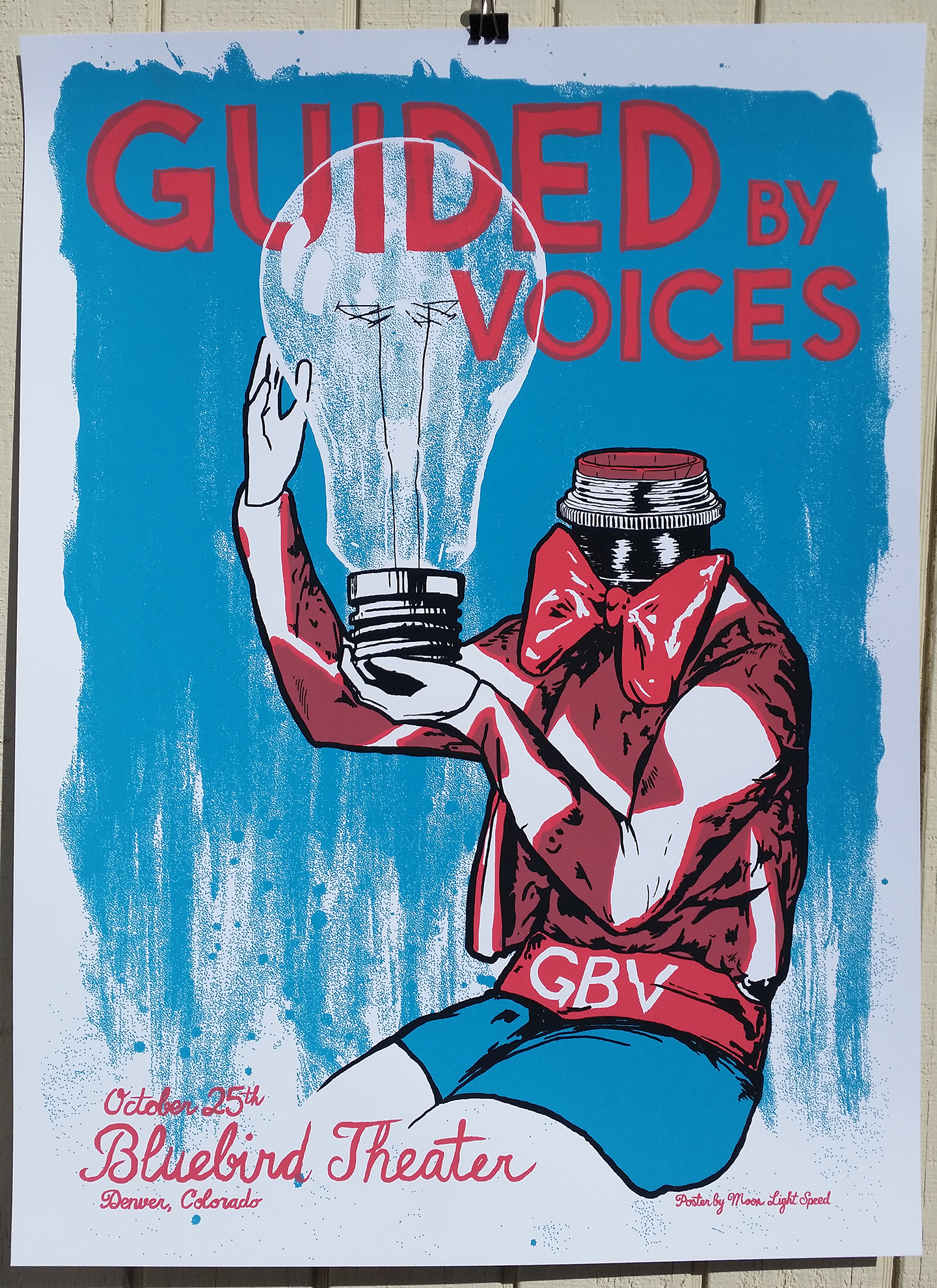 Official 3 color screen print on 100lb. cover stock for Guided by Voices at the Bluebird theater in Denver, Colorado. Limited edition of 100. 18"x24" print.