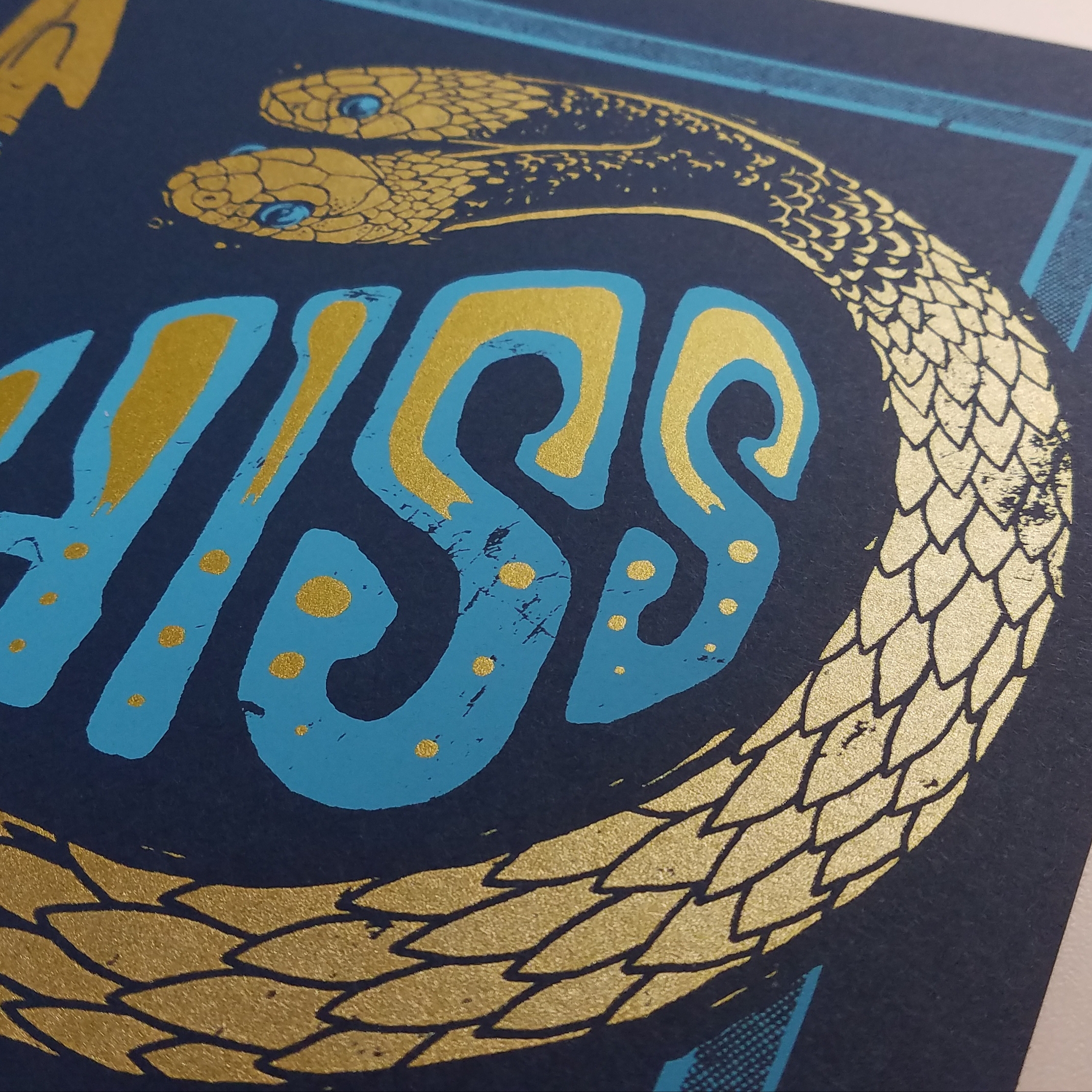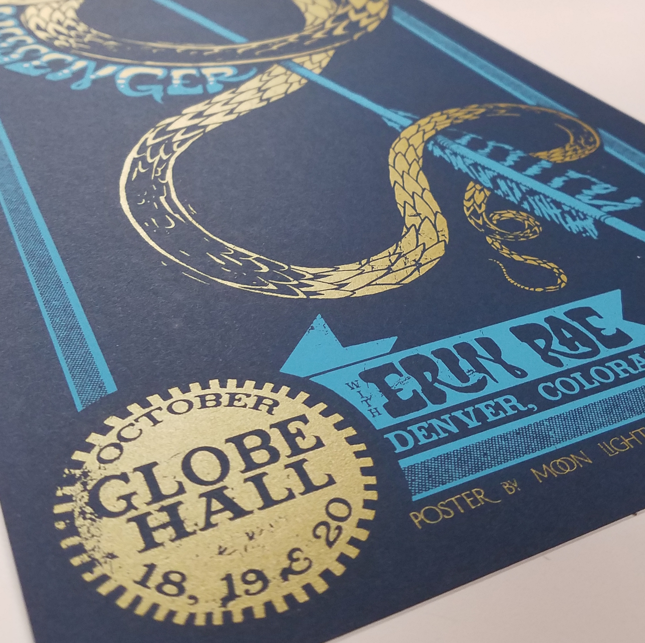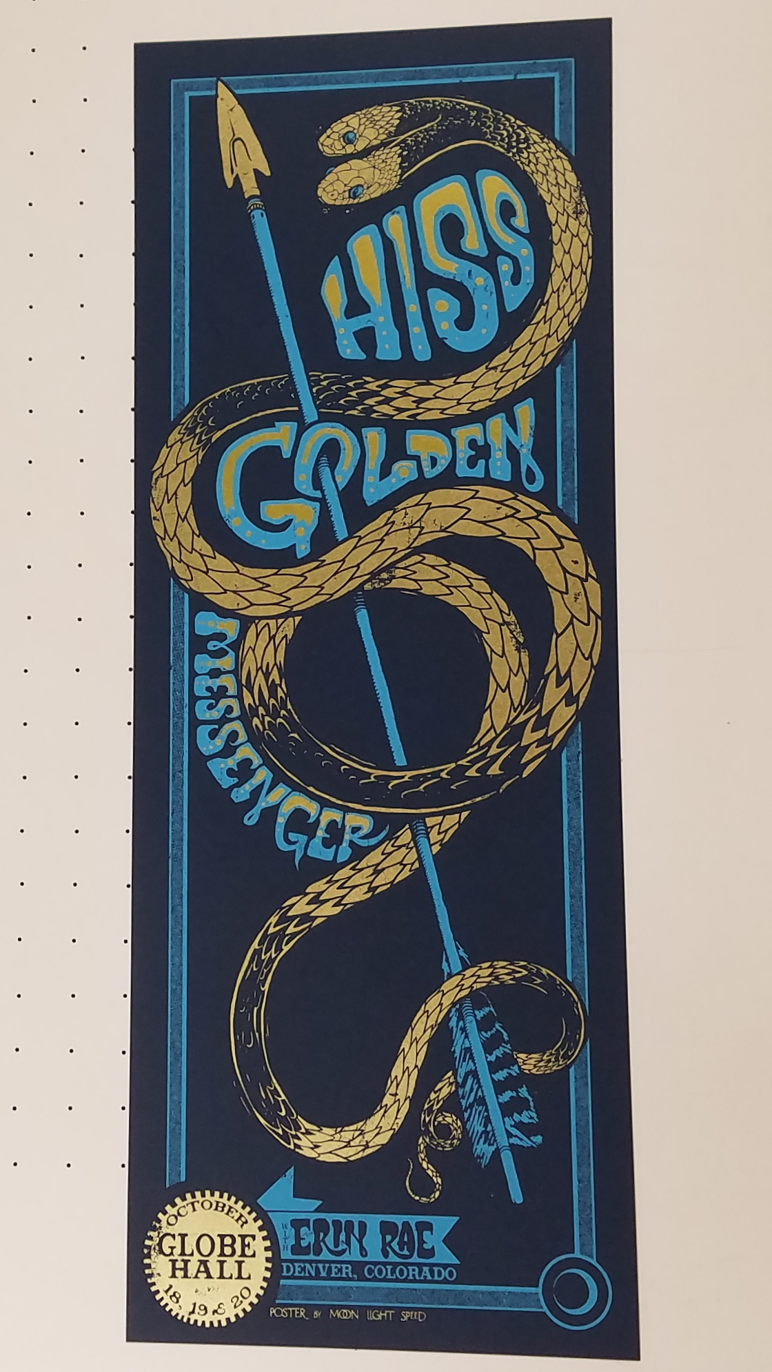 Poster for Hiss Golden Messenger and Erin Rae's 3 night run at Globe Hall in Denver, Colorado. Metallic gold and light blue, lovingly screenprinted by hand on thick, 100lb. French paper. Finished size is 9"×24". Edition of 100.