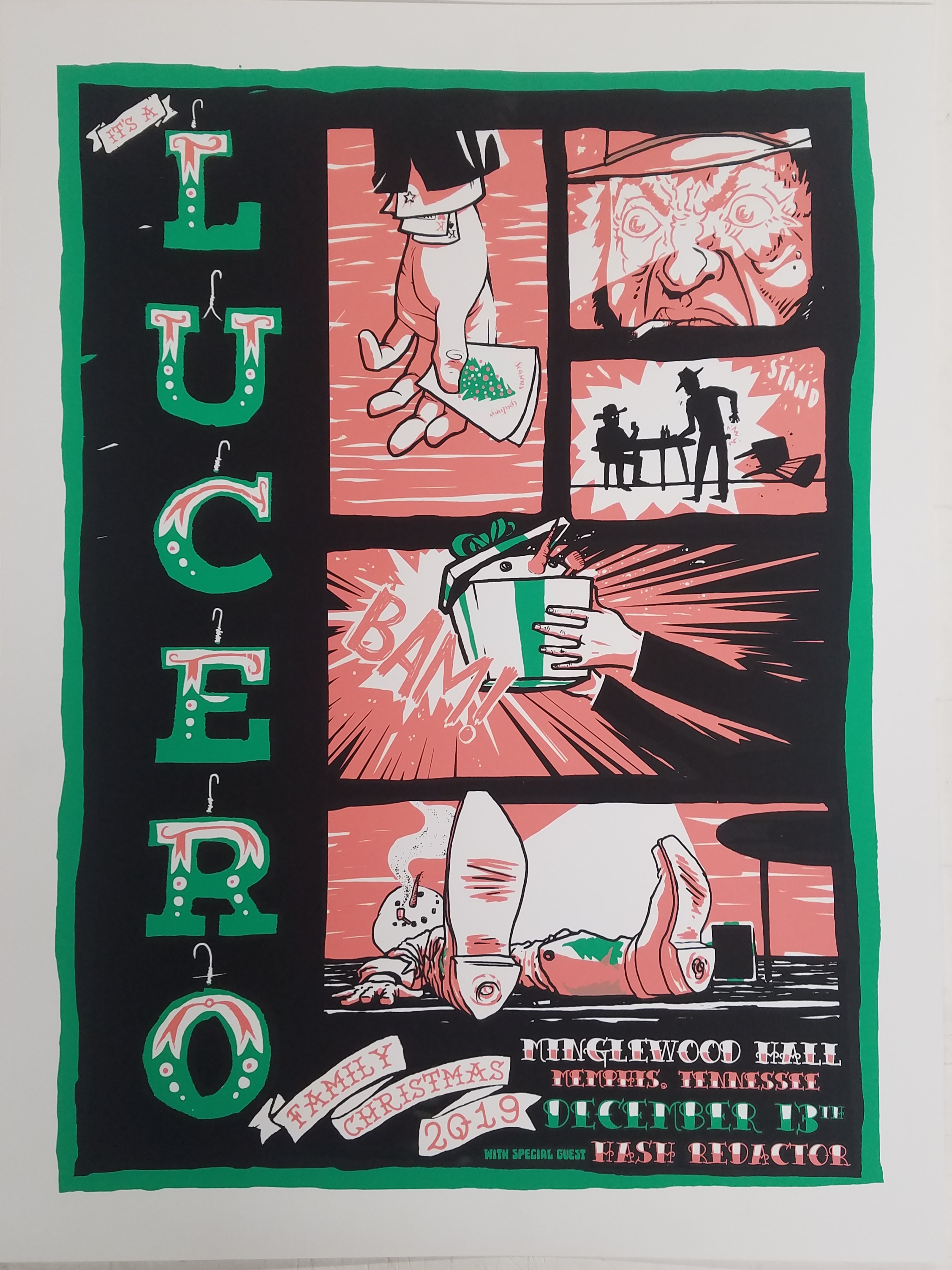 3 color screen print for Lucero's family Christmas 2019 show at minglewood hall. Final pri t measures 18"×24" on 100lb cover paper.