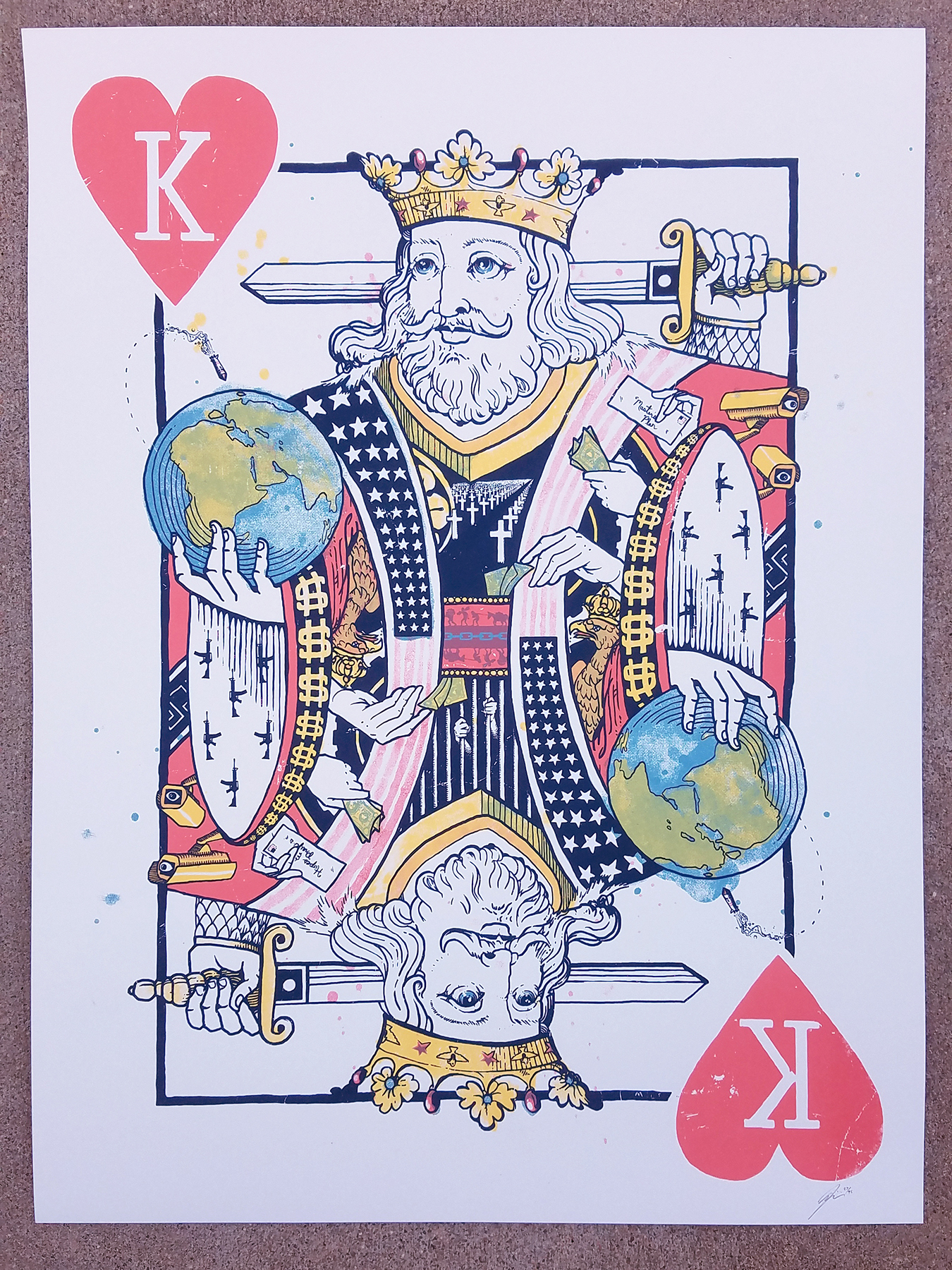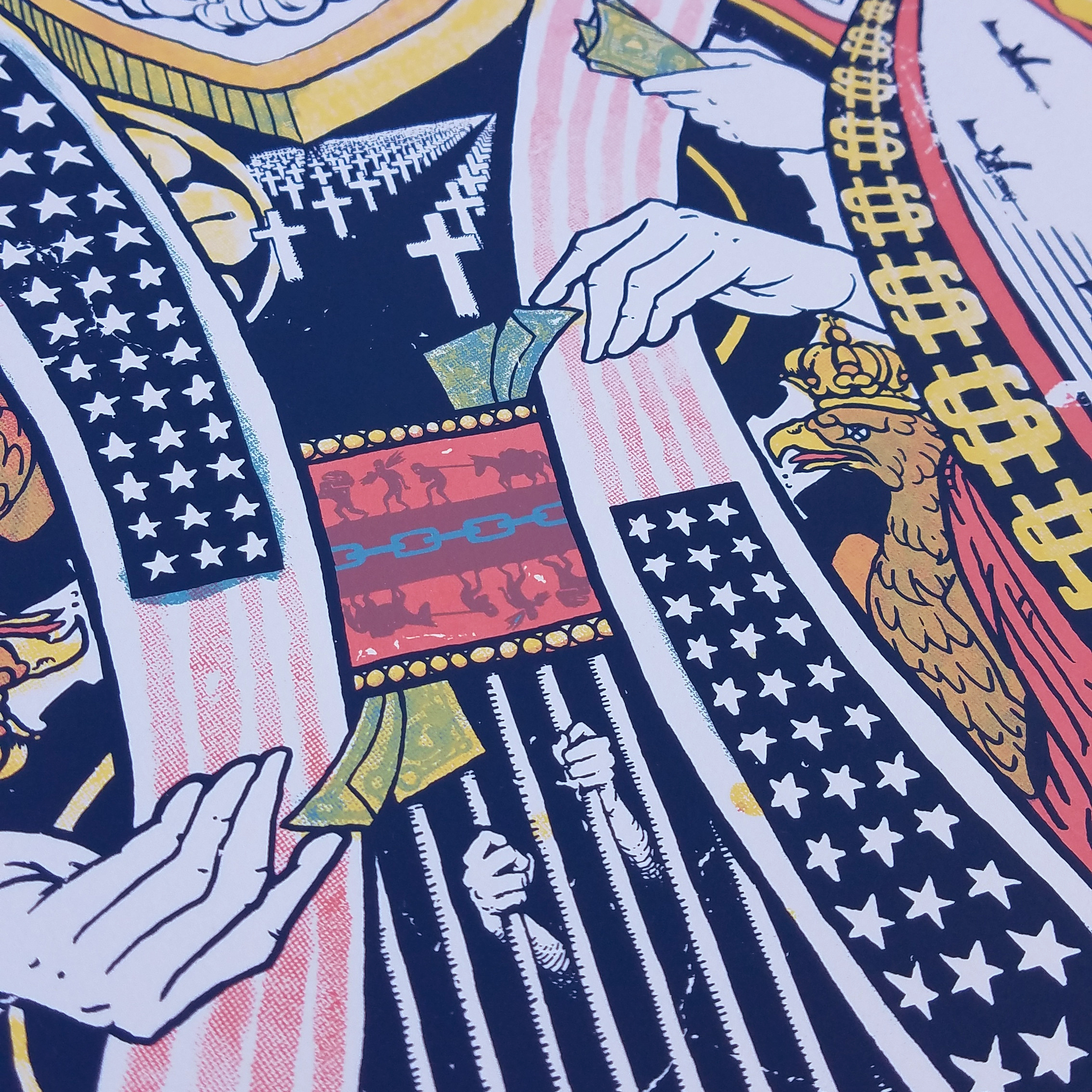 (2. Rise and Reign of Late Stage Conquerism) (3. uncle sam has slipped on his sword) 18"x24" 4 color screen print on natural 100lb. paper. signed and numbered edition of 80.