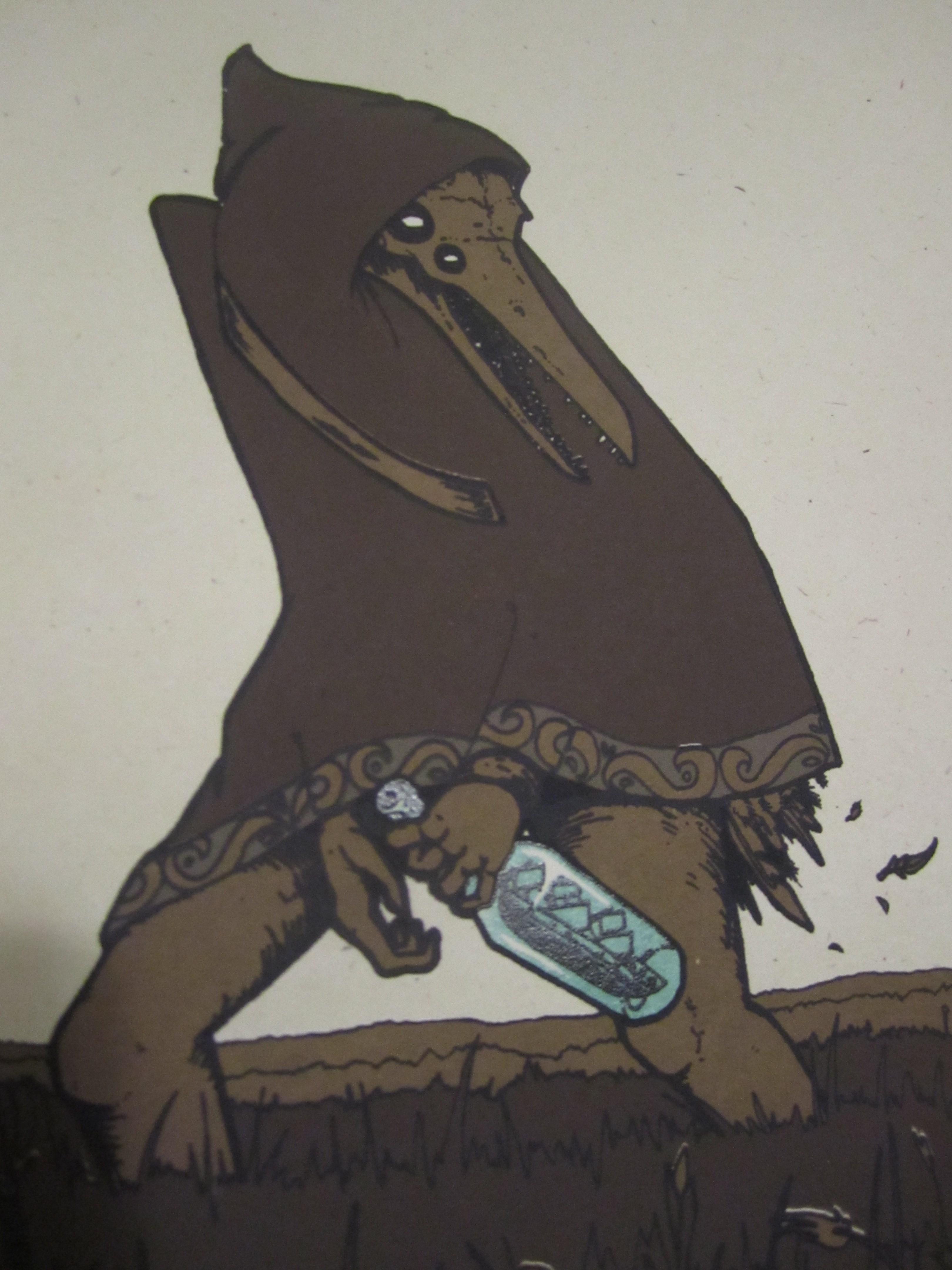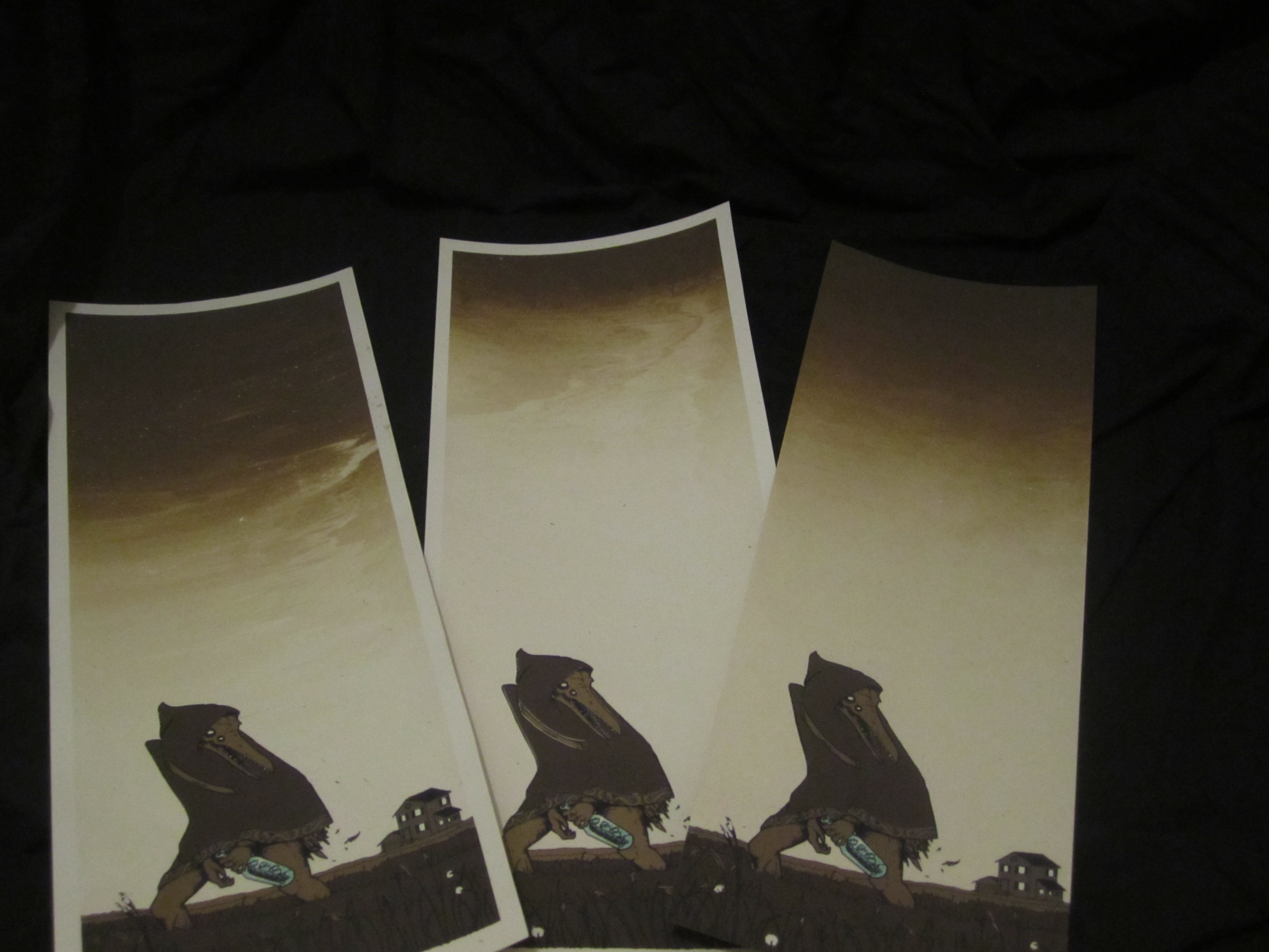 A gorgeous 5 color screen print involving gloss overlays and split fountain (tech talk for gradient). measures 9"x24", printed on 100lb. archival french speckletone paper.
