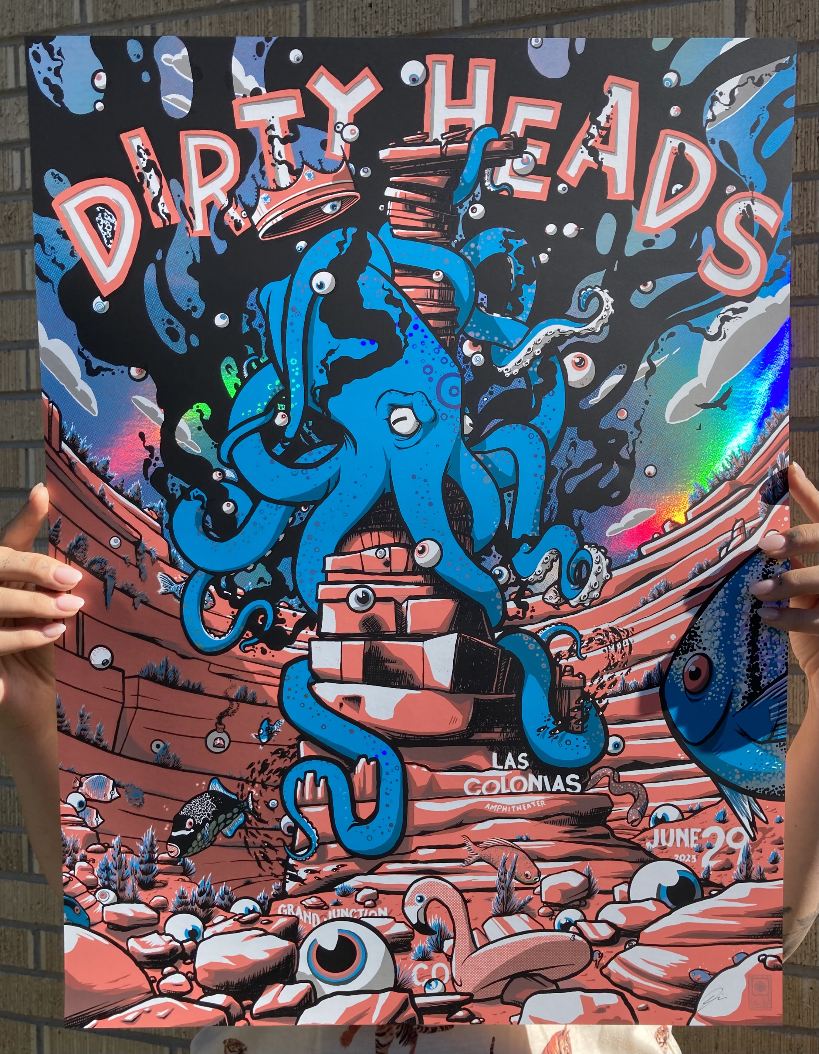 The official hand pulled screen print for Dirty Heads show in Grand Junction, Colorado! 4 color screen print on 100lb. Cover and a foil variant that includes 5 colors! Finished size of print is 18x24”