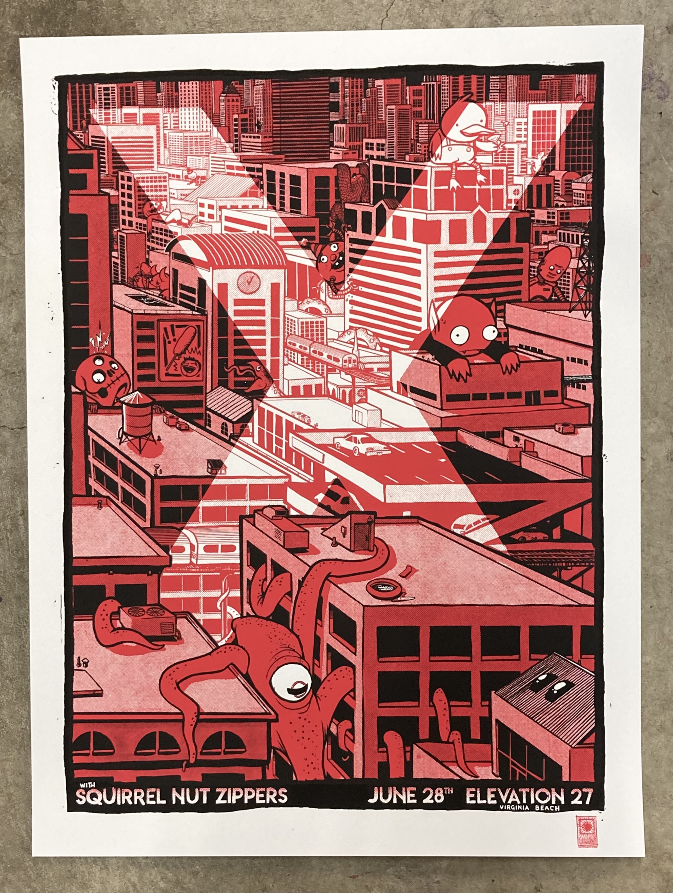 The official poster for the seminal punk rockers X and the Squirrel Nut Zippers at Elevation 27 in Virginia Beach! 2 color hand pulled screen print on heavy, 100lb cover paper. Poster dimensions are 18x24”