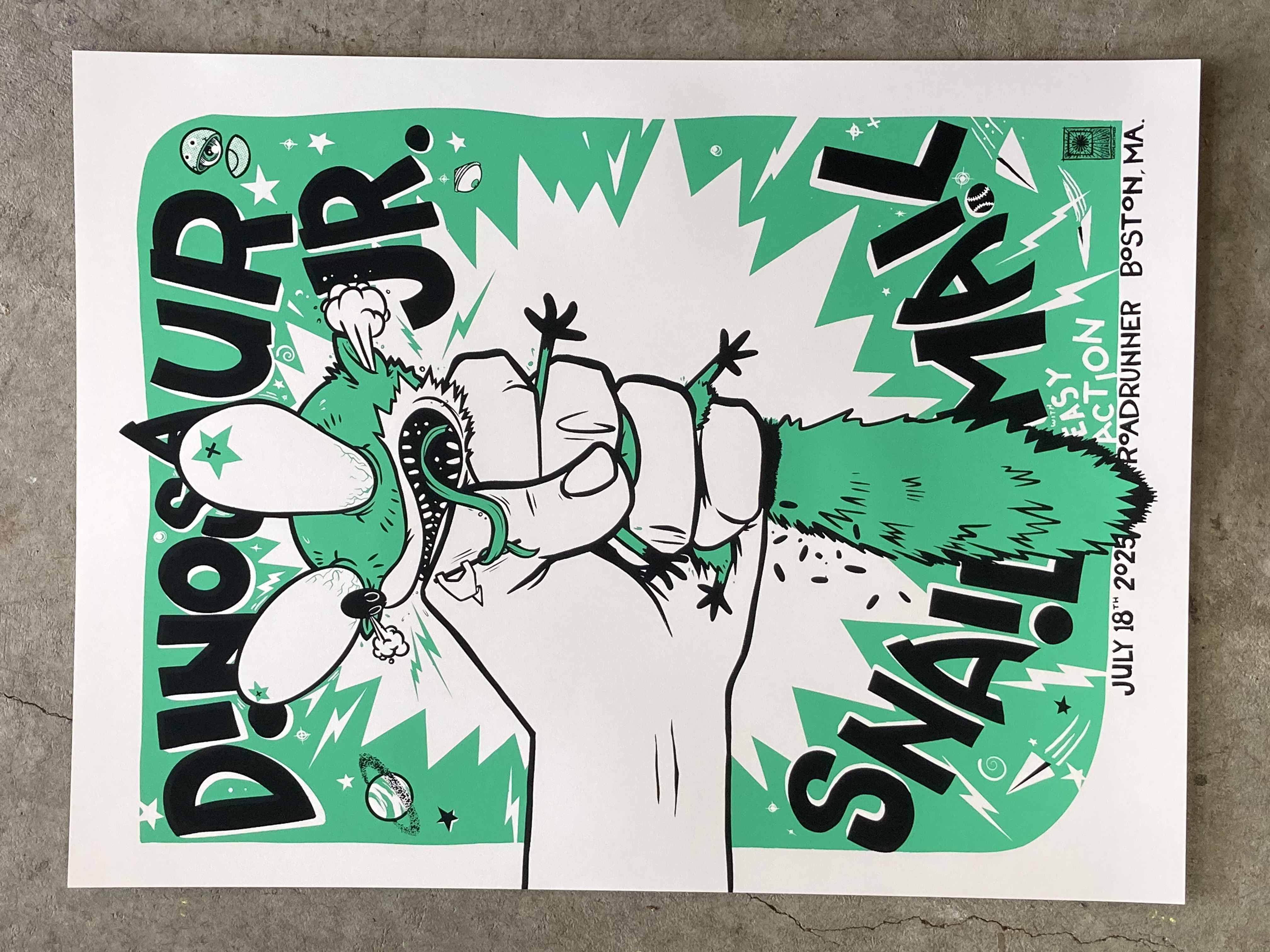 Screen printed poster for Dinosaur Jr, Snail Mail and Easy Action at the Roadrunner in Boston. Print is 18x24” on 100lb cover stock paper. Signed and numbered by artist, me! Enjoy!