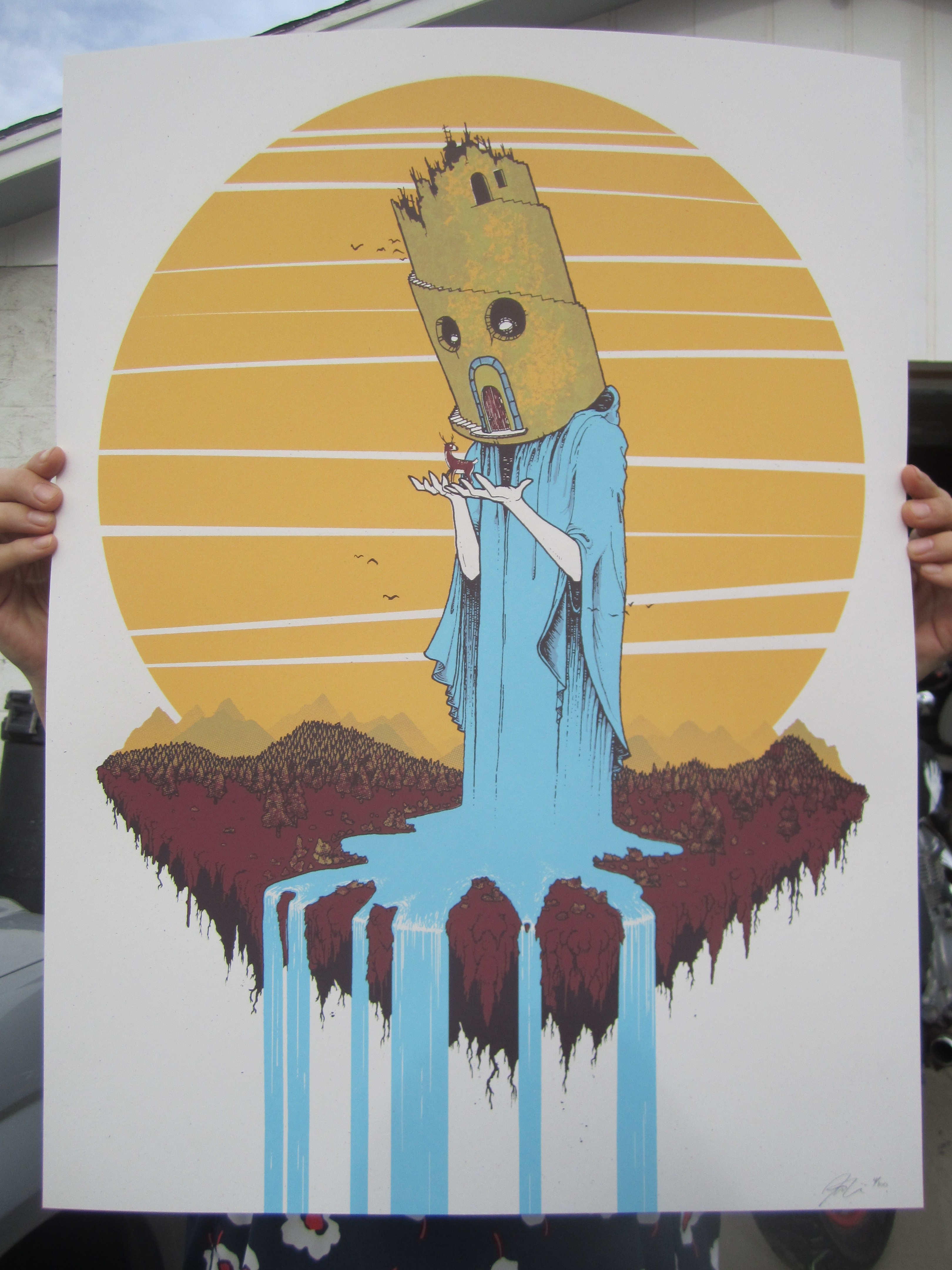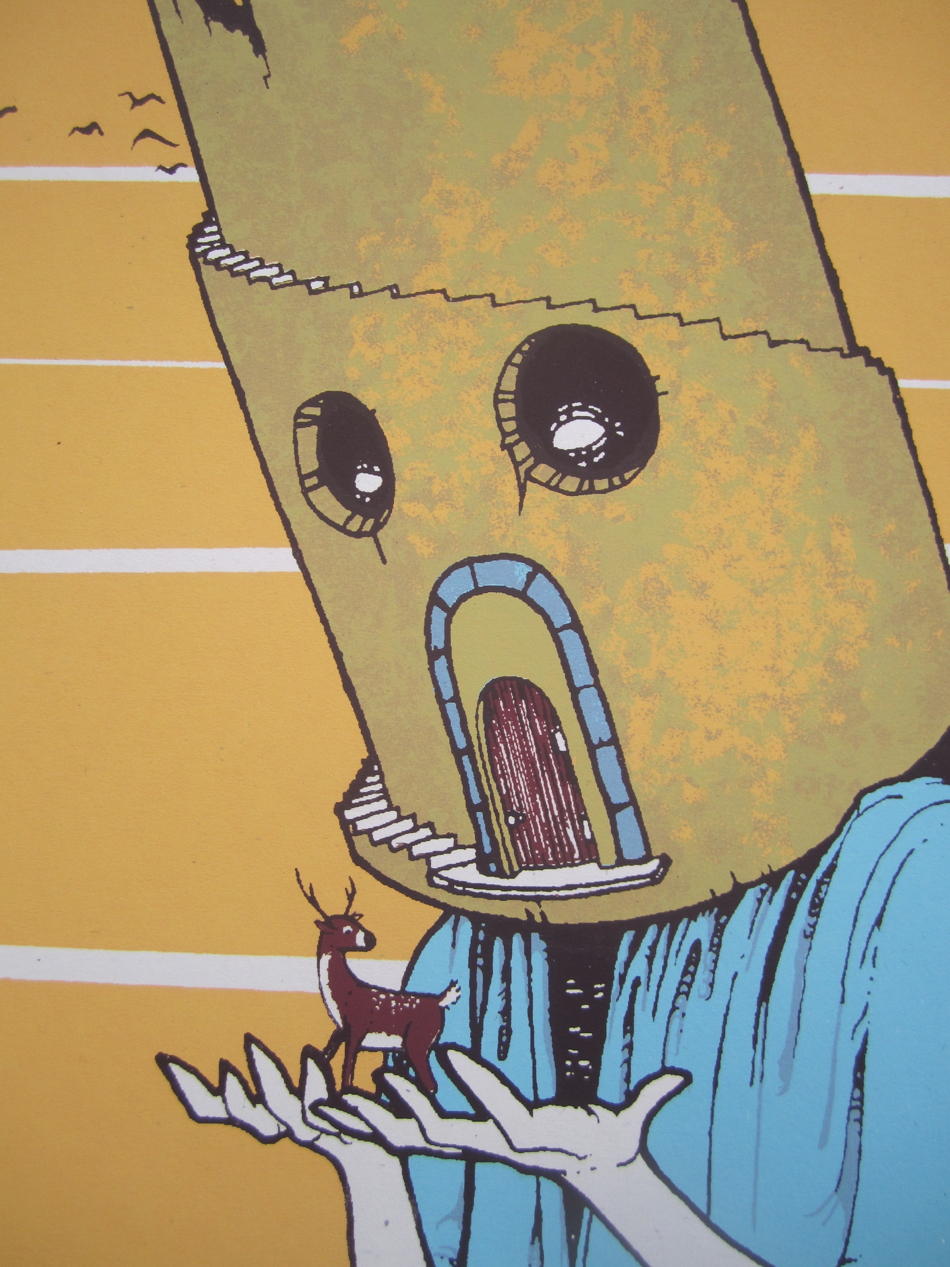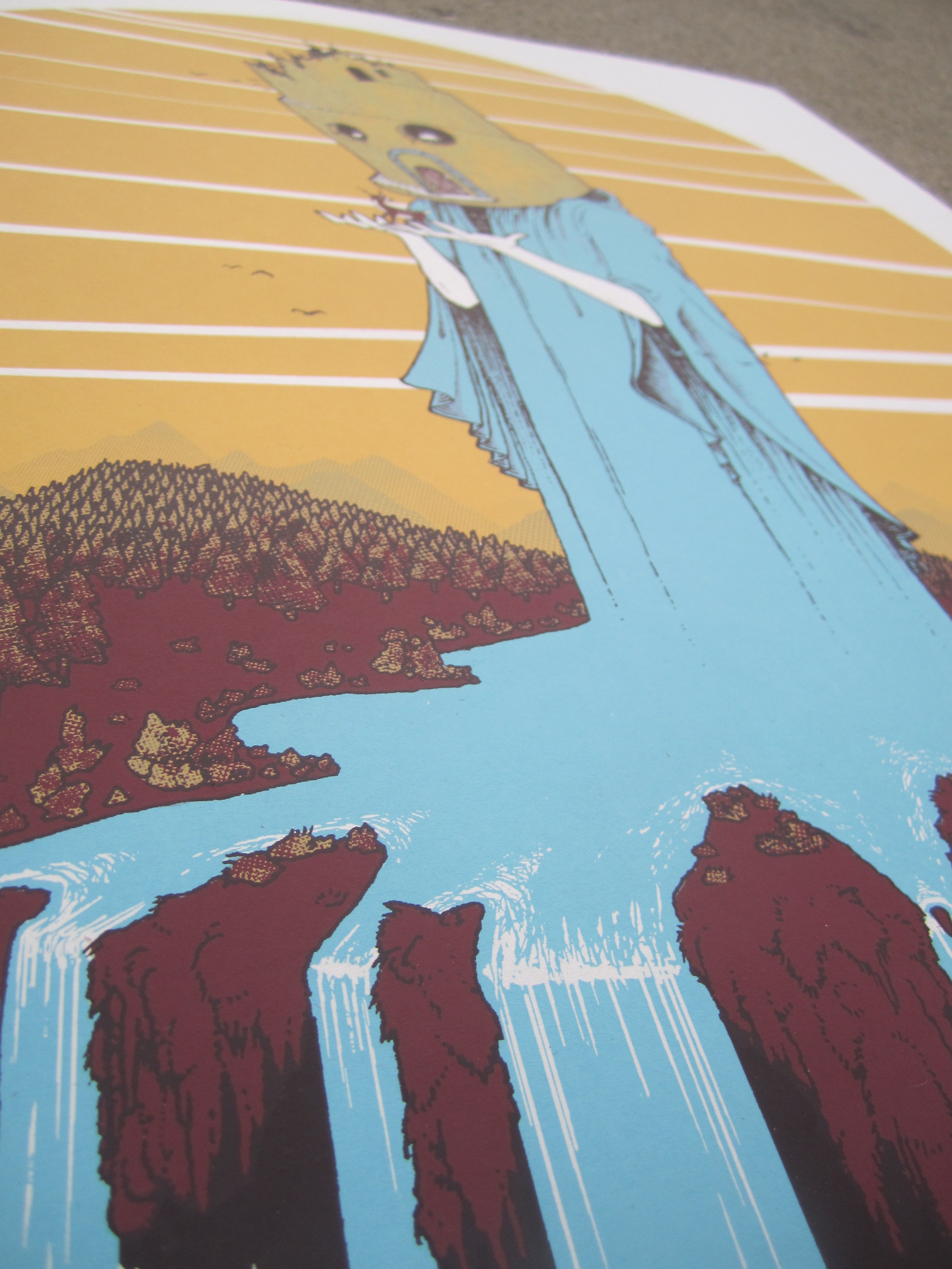 the purveyor of wilderness is making his rounds. 4 color transparent overlay. hand drawn, hand printed by yours truly. 18"x24" on 100 lb.archival french speckletone paper.