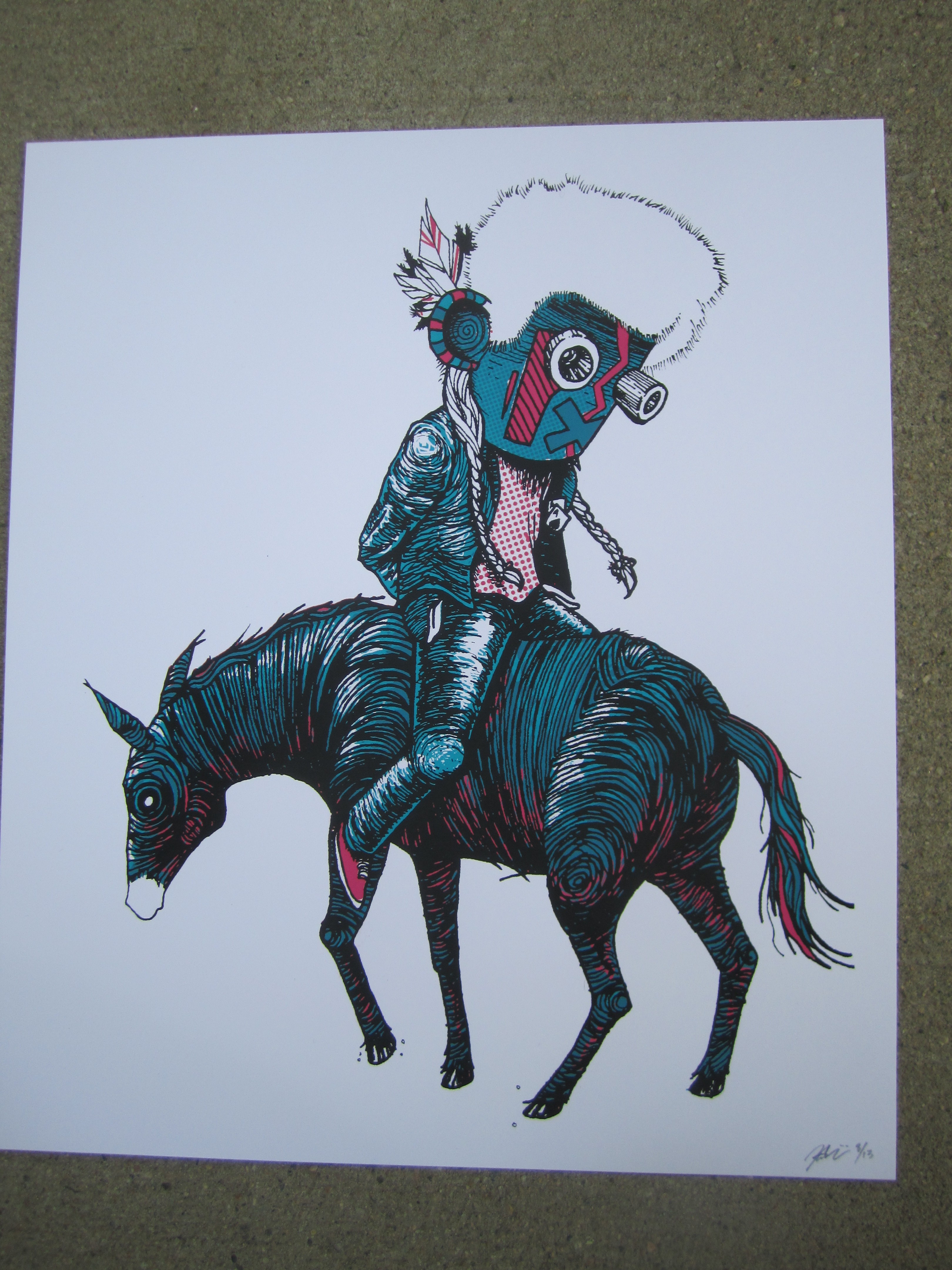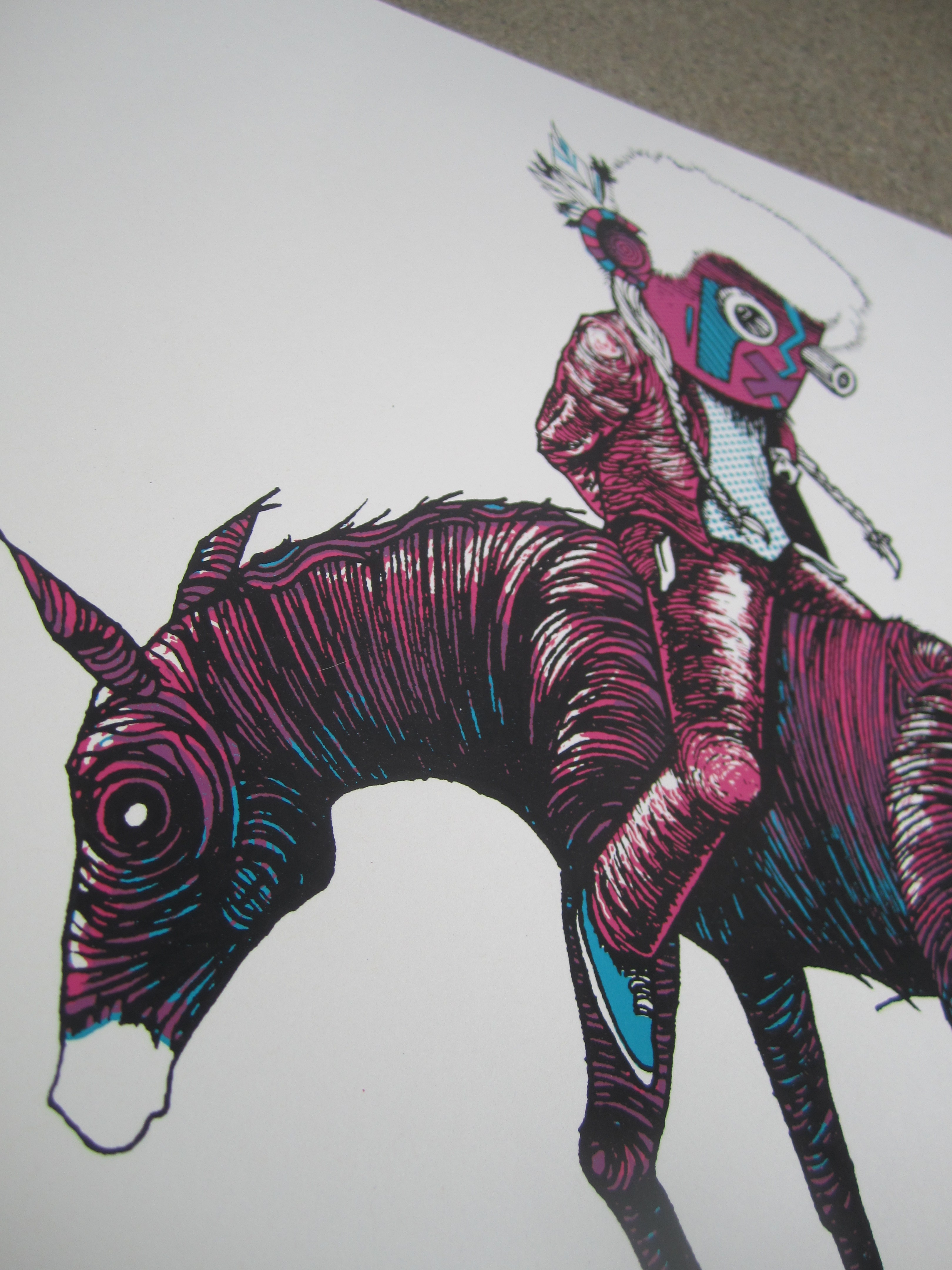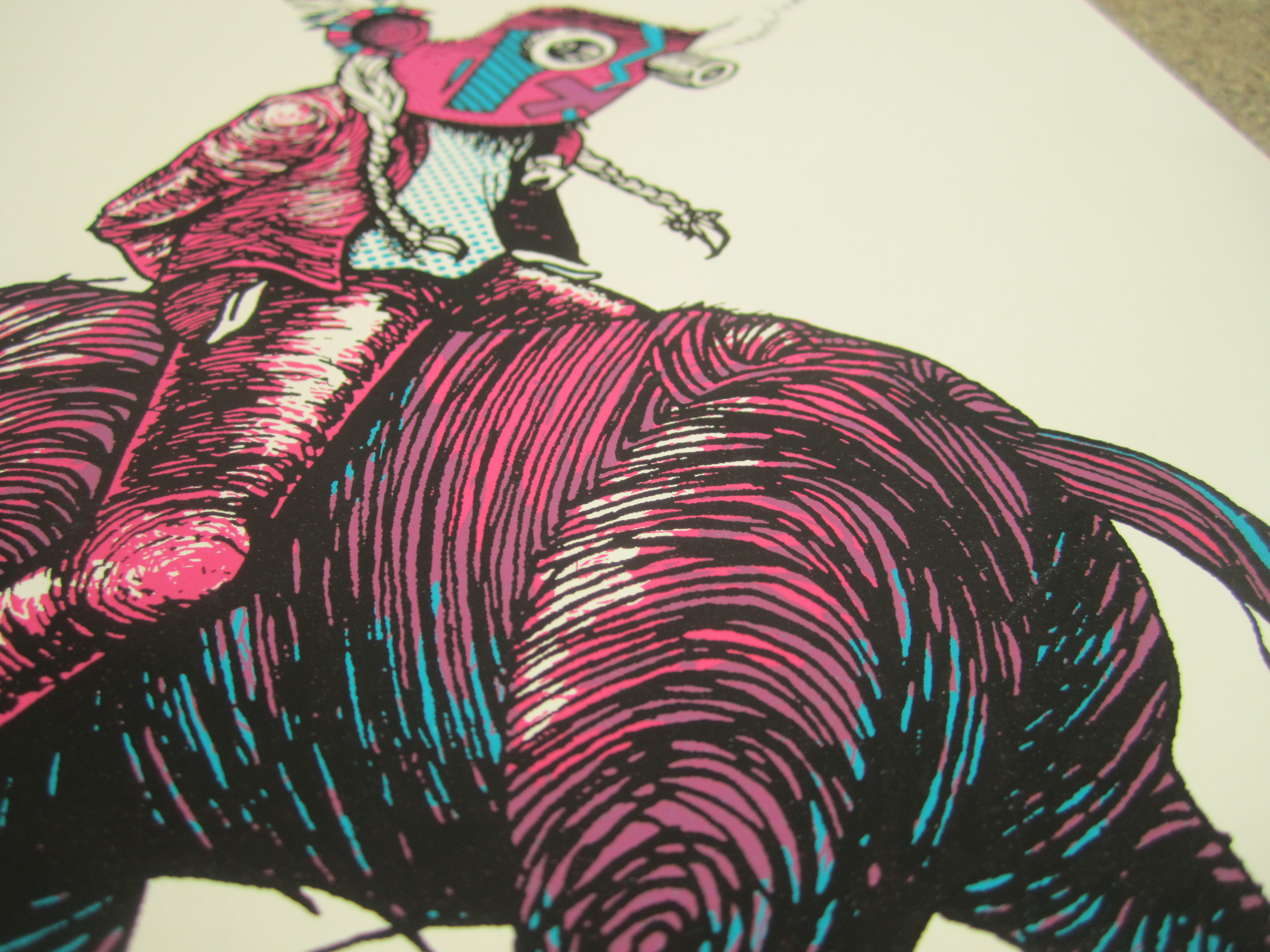 Lost, broke, caught cheating, and all you've got left is this godforsaken mule. 3 color transparent overlay on archival french paper. be sure to specify whether you'd like the blue or magenta variant.